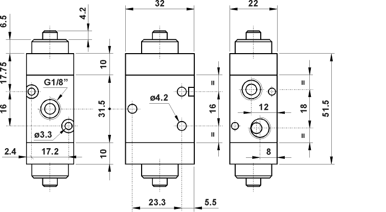 | 321 2P | 00.133.4 | 1/8" | 550 | 2 - 10 | -10 ... +60 | Анодований алюмінієвий кронштейн корпус, нікельований золотник, ущільнення з NBR. |