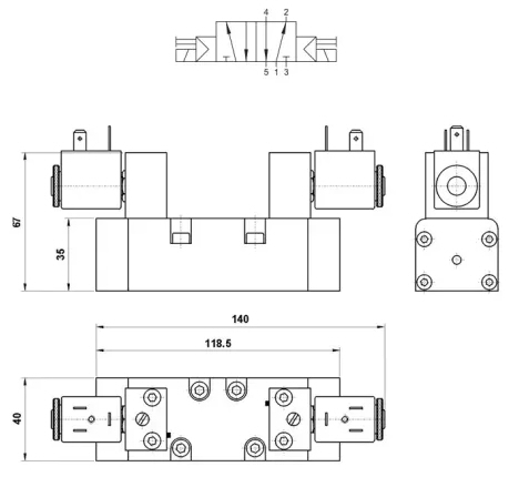 - Тип розподільника: 5/2 (два положення, п’ять портів)